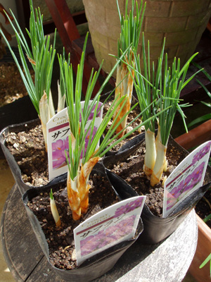 ネットでいろいろな種や苗を取り寄せているダンナ君先週~【サフラン】が届きました。パエリアに使うあのサフランの苗です。沖縄でちゃんと育つんでしょうか?? 『サフランを育ててどうすんの~??』『花粉を集めて販売するんだよ~高値で売れるんだよ・・・・』 だって ほんとかい!!苗の代金より送料の方が高いお買い物なんです。 (ーー;)
