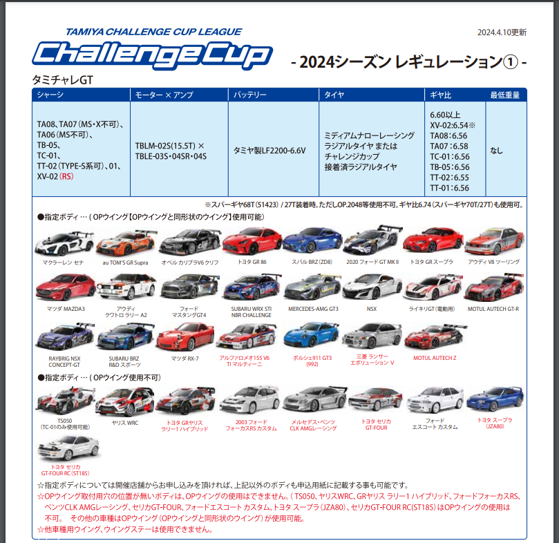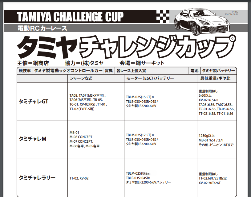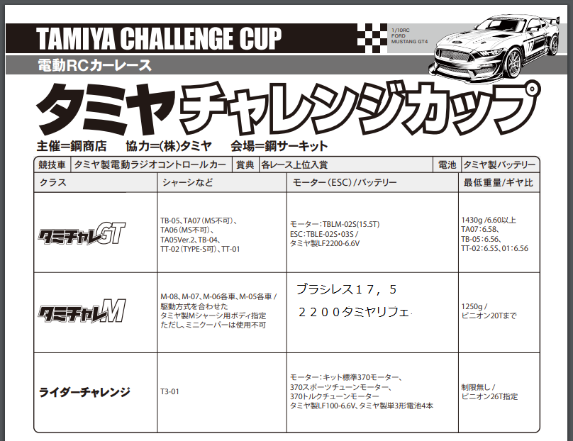 こんにちは 鋼商店です4月27日 日曜日に タミチャレがございます (第二戦目)今回のカテゴリーは 4つGT Mラリー(初) ラリー KIMI ですお天気は 大丈夫そうピットオープン 10時 練習開始11時くらいお昼ご飯ありません 参加賞ありません 最後に全員に当たる豪華くじ引きはあります予選1回 決勝1回 ポンダーはKO使います レンタル無料です 1回1回はめ変え制でいきます参加費 おひとり1500円 ほんの少しですが 親子割などございます当日エントリーOKOK お気軽にご参加お待ちしております2時すぎくらいには 終了予定その後は お店営業終了させていただきますよろしくです(^_-)-☆GTは ライキリボディ禁止で 1380グラム規定がありますのでお気をつけを ひぐちくん KIMIとMラリー わたなべさんラリーとGTでエントリーされておりますお昼ご飯ないので 朝マックでもしてきてね