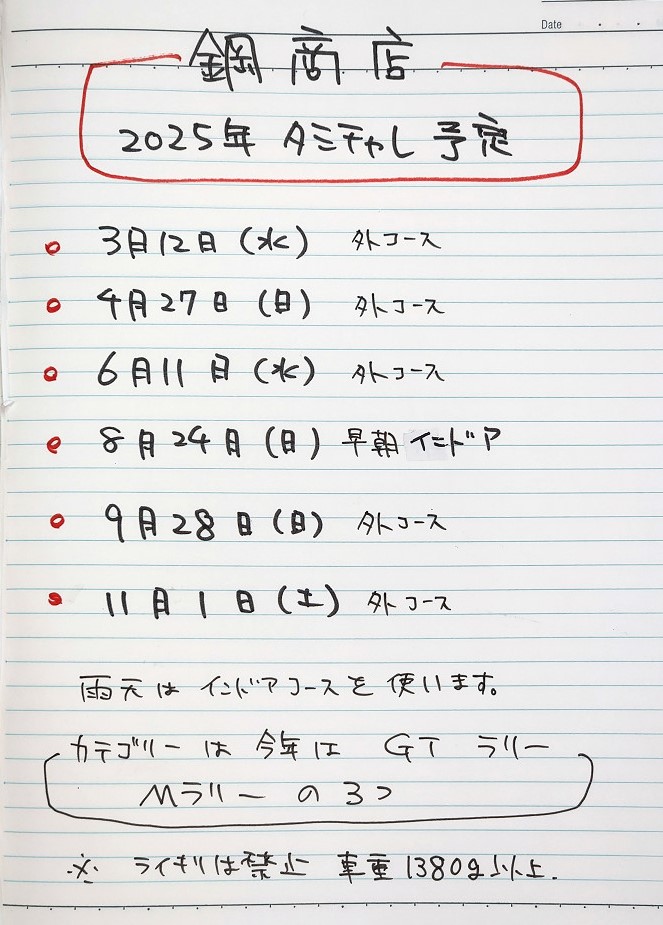 あけましておめでとうございます今年もよろしくお願いします<(_ _)>タミチャレ2025日程 (予定)出しましたMラリー 用意しといてくださいー お願いしますー