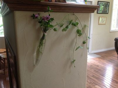 この花瓶はちょっとお気に入り。横に倒したり、つったりして飾ります。中身は雑草^^;
