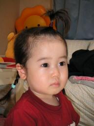暑い!暑すぎる!!ここの気温はおかしい。我が家にはマメの生まれたときに買った、温湿度計がある。本日の昼間の我が家の室温・・・36度!さ、さんじゅうろくど???体温やん!!!アタシの平熱なんて、35度台。気温ではなく、室温が体温を上回ってしまった。念のため言っておきますが、我が家にもエアコンなるものはあります。でも、嫌いなんですよね~エアコン。冷房も暖房も嫌い。冷房はこ一時間付けていただけで、ひざから下が重りのようになるし、だるくなる。暖房はあのなんともいえないモアッと感がダメ。でも、この暑さは尋常じゃない。マメも常に風呂上りか、通り雨に降られたかのように髪がぬれている。汗をかいている・・・程度のものじゃなく、シャワー浴びたの?位ぬれています。だから、今日はこんなことしてみました↓二つにくくった髪を、クルンと丸めてみました。おまけに前髪はパッチンとな。私がケタケタ笑っていたら、本人は鏡をわざわざ見に行き、「かーいー、かーいー(かわいい、かわいい)」を連呼していました。強引に同意を求められたので、「そーねー、キレイキレイしてかわいくなったね~」と褒めておきました。で、結局あまりの暑さに外での活動は断念し、トイザラスに逃げました。で、お茶目なものを買っちゃったんです。写真とってないので、明日公開します。乞うご期待♪しかし、この猛暑、どうしてくれよう。。。