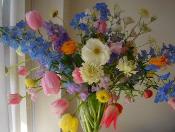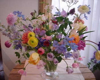 土曜日に残ったお花を活けました。 チューリップが多いのでステムのある花器に。 春の花はパステルがいいね。 透明感がいっぱい。 くるくると回してみました。 オレンジのチューリップ・バレリーナとラナンキュラスが効いてます。 活けて1日たってるのでチューリップが あっちこっち向いてとってもキュート。 今日も4:30起きして花市場。 帰ってきてからお店でお仕事。(お昼まで) 水揚げが済んでから、子どもの中学校説明会。 だからとっても眠くて疲れてるのに夕飯にビール飲んじゃったら やっぱりとっても眠い・・・・・ なんとか立ち直って明日の花教室の準備しないと。 (ブログなんて書いてる場合じゃないかーーーー。) がんばりますっ。