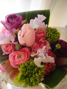 たいへんお久しぶりでございます。 先週から家のリフォームが始まって、何かと忙しく、パソを占領される時間も増え なかなか更新できませんでした。すみません~~~ こんなに大掛かりな家のリフォームも初めてのことなので ブログにも書いていきたいと思っています。 近々、リフォーム大変話もアップしていきますのでおヒマな方はそちらも見てやってください。 まっ、とりあえず今日は今年初めての花あしらい教室、基礎コースだったので そのお花をアップしようっと。 本日のレッスンはそのまま飾れる花束。 最近お店で商品化しようという話がでていて、ちょっと作ってみたかったの。 茎の根元にお水の入ったプラの器が入っています。 ラッピング中心に撮ったのでちょっとヘン? この根元に水入りプラが入ってます。 私が作る花束は花をあまり短く切らないのが定番。 でも、そのまま飾れる花束だと長く作ると倒れてしまうので必然的に 短く切りそろえることになります。 ちょっとパリちっくに出来上がった♪ くるくると回してもう1枚。 この葉っぱはドラセナ。大きいのでくるりとしてホッチキスでとめてあります。 こんな風に葉っぱをホッチキスで止めたのは生まれて初めてーーーー。 今年お店に入ってきたスタッフに教わりました。 この葉っぱがなんともステキなのと微妙な色合いのカーネーションが 気に入って、全体的にアンティークっぽい雰囲気の花束になりました。 白いラナンキュラスとギザギザ咲きのチューリップ・ベルソングがかわいいっ! 昼間、とってもいい光が入ったので久しぶりにきれいに写真が撮れてうれしいです。
