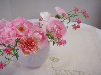 部屋に飾ってあった大きな2つの花あしらいを枯れた花を捨てて *白い陶器に大きく活ける。 *ピンクのガラスの花器に小さく活ける。 に変身させました。 ピンクの花あしらい 写真だとはっきりわからないけど、この花器おいしそうなピンク色。 残った花の中からピンクの花ばかりを集めました。 おとといの日記で満開と紹介したラブユーの水が下がってしまったので 思いっきり短くして活けなおし。 バラが水が下がったときは思いっきり短くするとたいてい復活します。やってみてね。 なんとか花器の中に納まっているけれど、この花器、底がまんまるなので すぐに花が飛び出してしまいます。 なので底にビーチグラスを置いて、口元にセロテープ貼ってます。 小さいバラは前にも紹介した「須恵姫」です。 去年の20日頃に入荷したバラだから3週間ぐらい咲いている。 驚くほど長持ち! この写真、天気の悪い昨日、蛍光灯の下で撮りました。 大きい花あしらいのほうはさすがに蛍光灯の下の写真は暗くてNGでした。 自然の光の中で 今日、部屋に自然光が入り始めたので撮ってみた。 ちょっと天気がよすぎて光が強いかも? あと少しで花器から飛び出しそうです。