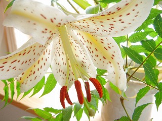 6月の終わりに仕入れしたヤマユリがただ今満開。(・・・をちょっと過ぎた) ユリの中でも特に香りが強いので玄関から1番遠くのリビングに飾ってあるのに玄関を開けた途端ヤマユリの香りでいっぱいです。それだけで私は幸せいっぱい♪香りが強いのが苦手な人にはきついかも。 ユリはもともと好きな花だけれどヤマユリは特に大好き。見た目は大きくて、斑点もあって繊細さとはほど遠いんだけど、なぜだろう・・・・・・・・と考えてみた。きっと今の季節にしか出会えないから。今しか会えないと思うと心躍るものなのです。ちょっと前に咲いてたササユリや乙女ユリみたいに。