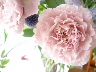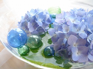 今日も早起きの花市場。前回紹介した セクシーピンク 仲卸しに並んでました。お店で売ったら¥1200~¥1500くらいになりそうな高価なお値段がついておりました!!そんなに高いセクシーピンク、やっぱりいらな~い。 大好きなブルーのアジサイ。毎年この季節には買わないではいられません。 大きな房のときはいくつかに分けて。枝のままのアジサイを葉っぱつきのまま深さのあるガラスの器にいれて小さな房をそのとなりに浮かべます。空いたところにブルーとグリーンの浮き玉を。 このアジサイ、あまりに大きな房だったのでもうひとつ小さく切り取りました。庭のコリウスの赤い葉っぱとブルーベリーを一緒に活けました。 先日ちょっと紹介した エレンジューム。きれいな深いブルーだけど、ちょっとトゲトゲで痛いです。