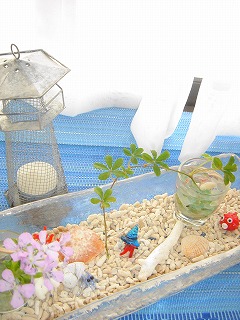 もう7月も終わってしまう。梅雨はまだ明けないけれど早く出窓を夏に模様替えしなければ。と、毎日思い続け本日やっと模様替えいたしました♪ ガラスのお皿にサンゴを敷いてシュバーバインと浜なでしこをちょっとだけあしらって。 浜なでしこ といいます。やさしい紫で小さめな花が控えめでいいね^^ サンゴや貝殻ばかりよりグリーンが入るとより涼しげになるので鉢物のシュガーバインを一枝折って添えました。一緒に写ってるガラスのやどかりやハリセンボンは「Summer」という入れ物に大切にしまってある(そしてこの季節にだけ登場する♪)私のお気に入りです。