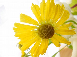 10日前の教室で残った花がまだ微かに咲いています。ヘレニウムキク科。 和名は【ダンゴギク】花の中心部が半球状に盛り上がるためこの名前がついた。・・・ということですが、あまりにもストレートな表現ですね。もう少し可愛らしい名前をつけてあげたかったなーと。といいつつ、日記のタイトルにしてしまう私。結構気に入ってたりして(笑) 明日久々にお客様がいらっしゃるのでこのダンゴギク(←結局こっちのなまえを使う私。)を使って花あしらいしてみました。食事のときのダイニングテーブルに置きたかったのでステムのある花器に活けてみました。低いとたーーっくさん料理が並んだときにジャマになると困るので。(←ジャマになるほど並ぶとは思えないが。)手前にシャバシャバと写ってる スモークグラス がいい雰囲気です。