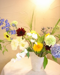 今日は夏休み前の最後の花あしらい教室。フリースタイルコースの生徒さんたち。ダイナミックに活けてくれました(*^0^*) 大きなブルーベリーの枝を2本も使って背の高い器をいかしてクレマチスを流れるように活けました。 同じようにブルーベリーを使ってますがヒマワリを合わせると違ったイメージになります。花器に使ったのはシチューポット。ざっくりとした花あしらいにぴったり♪ ヒマワリも生成りのミナズキと合わせるとやさしい雰囲気。 黄色のヒマワリをピンクやオレンジの花たちと活けるとキュートな感じ。ピンクのダリアが効いてます。 あと1人生徒さんが来たので5人でレッスンでした。(写真に失敗・・・)これで明日からしばらくお教室はお休みに入ります。ブログはちゃんと更新しますので~~。ネタがなくならないといいんですけど・・・・