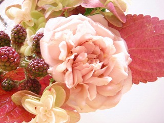 紅葉している柏葉アジサイと派手すぎない赤いコリウスの葉が気に入ってココ何週間かずーっと我が家のおトイレに飾っています^^最初は柏葉アジサイとコリウスだけだったのがこの写真のように イブシルバとブラックベリーを一緒にあしらったらともに渋い色なのでアンティーク風な出来上がり♪ 花の色に合わせて器もアンティーク風なアイアンのもの。イブシルバが開く前だと、満開のときと雰囲気が違いますね。 なぜにして、この色合いの花あしらいをずーっとおトイレに飾っているかというと我が家の中では珍しく壁もクリームでデンキも白熱灯の赤い色。なのでこんな落ち着いた花が似合うんです。リビングは白熱灯もあるけれどお花のレッスンのときにちゃんと色がわかるように自然に近い色に見える蛍光灯(だったか?)も組み合わせてあるのです。柏葉アジサイとコリウスは庭に咲いているので枯れてしまうまでこの花あしらいは続いていきそうです。