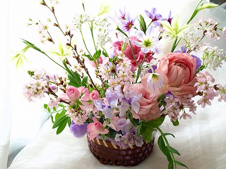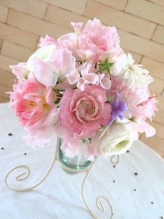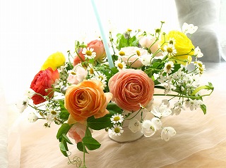 2,3日前に生徒さんから うれしいお知らせ のメールが届きました。 「先生~。うれしいお知らせちょっと聞いて下さい(゜▽゜)ラナンの小さいツボミ咲かないと思ってあきらめていたんです。でもためしに花瓶にさしていたら・・お教室から一週間。ツボミが開いてきました4つも(^O^)/桃の花もどんどん咲いてます。Hotなお知らせでした。」 私の花教室は「季節のお花を楽しむ^^」ことが目的です。生徒さんがレッスンで使った花を家に持ち帰ってからどんな風になっていくのか毎回とても気になります。なのでこのメールは何よりもうれしいお知らせでした(*^o^*)このメールを読んで我が家に残っている花たちを見回してみたら我が家のラナンの蕾も咲き始めてる~~ラナンだけでなくデルフィのパールブルーのわき芽の蕾もサイネリアの蕾も咲き始めてた!そこで2番目の花たちを集めて小さな花あしらいをしてみました。 全部我が家にやってきてから1~2週間以上経った花ばかり。 ラナンキュラス・Mピーチ ラナンキュラス・黄色(としか書いてなかった)わき芽の蕾が咲いたので最初の1番花より一回り小さい。 豆の花にはかわいいお豆がなっていました。 切花になってからも健気に蕾を咲かせ続けてくれる花達は何よりもかわいくて愛おしい。 今回頂いたメールがとてもうれしかったのでここで紹介しちゃいました。生徒さんからのうれしいお知らせは本当にうれしいんですなので他の生徒さんもうれしい出来事があったらメールくださいね~