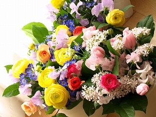 1ヶ月ほど前だったでしょうか、生徒さんから 「お友達が卒業のときに先生にお花を渡すのでお花屋さんを紹介してほしい」 とメールをもらいました。 場所は「茗荷谷」 知り合いが近くでお花屋さんをやっているけれど、金額がまとまって交通費がでるのなら 私がやってもいいかなーーと思い、そう返事をしました。 そして、私が「卒業式に先生に渡す花」の仕事を引き受けることになりました。 前もって依頼者の方から各先生のイメージが送られてきて それになるべく沿うように花の仕入れをしアレンジメントを作りました。 全部で10人分。 全部違うように作るのはあまりにお花のロスがでてしまうので 2人ずつ同じにして5種類作りました。 これは60代の先生に。 外でもお花見、家でもお花見を楽しんでもらおうと 啓翁桜をメインに。 あとで聞いたらこの花が生徒さんたちの間でも一番 評判がよかったようです。 40.50代の男の先生に。 イメージする色のところに水色と紺色が入っていた のでブルーのアレンジ!に仕上げました。 40代の男の先生。 上のアレンジと似ているけれどオレンジ・グリーンが入って 元気な感じになっています。 40代、50代の女の先生に。 パステル系とか、かわいらしいイメージが書いてあったので ふんわりやさしく仕上げました。 50代の女性。 色が赤でイメージがバラでエレガントと書いてあったら ローテをいれないわけにはいかないでしょう~~ 実はローテ(この赤バラ)が苦手な私は最後まで買うのを 迷ったんですが、青とあわせて大人っぽく仕上げるなら いいかなと思い切って買いました。 出来上がりはどのアレンジよりも派手でした。 やっぱり赤バラの存在感はすごい!と再認識しました。 このアレンジ、仕入れして作るまではとても楽しい作業だったんです。 こんなに何種類も作ることなんて普段はないし、紹介してくれた生徒さんが 活けるのを手伝ってくれたし・・・・ ただ、お届けが大変でした・・・・・・(疲) 私の住んでる横浜のはずれから茗荷谷まではほとんどが首都高。 いつも市場に行くときは混雑のない湾岸線を走るので大変さはないのですが 市場の先から都心を走る首都高は超ハードです。 走ったことがある人はわかると思いますが。 まず空港中央を抜けたと思ったら「大渋滞」 結局、渋滞を抜けるのに1時間かかりました。 そして渋滞を抜けたと思ったら分岐につぐ分岐です。 間違えたらとんでもない方向にいってしまうので緊張の連続。 やっとの思いで目的の「護国寺」に到着。 あとは一般道を少し走れば目的地に着くはずだわ~~~ と、余裕でいたらとんでもありませんでした。 細かい地図をだしていなかったら迷いに迷い・・・・・ 30分以上かかってしまいました。 都内の道路はわかりにくいです・・・・・(T_T) 結局お届けにかかった時間は3時間! 帰りは渋滞にもあわず迷子にもならずに帰れたので1時間半でしたが 車の運転を4時間半もしたらさすがに疲れました~~~ ただ、このお届けおまけつきでした。 お届けが終わった後、一緒に行ってくれた生徒さんとランチを食べようといった場所が さくらまつりをやっていて、道路の両側がびっしりと満開の桜だったのです! その桜並木はすばらしく、運転の疲れも吹き飛び、桜の下をゆっくりお散歩。 ランチのイタリアンもおいしかったし、とっても幸せでした^^ 依頼してくれた方から「喜びのメール」もいただけたし 工夫して楽しいアレンジ作りだったし 桜はきれいだったし ランチはおいしかったので 大変な運転を差し引いても とても楽しく貴重なお仕事でした。 この仕事をさせていただけたことに感謝です(*^_^*)