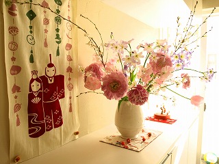 今日は3月3日、おひな祭り、桃の節句ですね(*^0^*)ギリギリおひなさまの紹介しちゃってもいいですか?玄関のおひなさまです♪ 手ぬぐいのおひなさまです♪玄関の下駄箱の間に結構スペースがあるので最初からここに飾ろう!と思って買ってきました。今の家、お花が飾れるところがたくさんあったほうがいい~~とあっちこっちに飾れる場所を作ってもらったんですがありすぎてときどき飾るものがなくて困ったりしてます。 ホントの色はこっち。淡いピンクの彼岸桜にスイトピー・ピンクダイヤモンド(チューリップ)パープルのMラベンダー(ラナンキュラス)・リューココリーネ。前紹介した「彼岸桜を活けました」を分解して淡い優しい色ばかりで飾りました。そばを通ると春の甘い香りがします。やっぱり優しい色は気持ちが落ち着いて癒されますね。