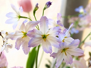 このお花 リューココリーネ といいます。1月頃から市場に並び始めて4月頃まで楽しめます。私にとって一足早く春を連れてきてくれる花。 全体はこんな感じ。細い茎がすーっと伸びて先端にお星様のようなお花がついてます。花びらはフチがブルーのぼかしだったり、ストライプだったり。他に白やうすいピンクのぼかしもあります。香りは独特だけれど私にとっては昔を思い出させてくれる懐かしい香り。でもそばを通った息子は「何のニオイ?くさいっ。」と怒ってました。ちなみに白いリューココリーネは葱(ニラ?)のようなニオイです。 蕾も最後まできっちり咲くおりこーさん。でも最後には茎がぐにゃぐにゃになってしまうのでお花だけにして浅いお皿に飾りました。最後の最後までどうやったら1番可愛く見えるかを考えて活け直すのが楽しみ♪ リューココリーネには初心に戻れる想い出があります。昔、永順先生の花あしらい教室に通っていました。先生の教室は第1回めのレッスンのときからお花は全部自分で選びます。本でしか見たことのない珍しくて綺麗なお花を前にして固まってしまった私。どの花をどれくらいどんな風に選べばいいのか皆目検討がつきません。しかも、お花には値段がついていないのです!そんなときひとつ輝いて見えるお花がありました。リューココリーネです。それは、この花にだけ値段がついていたから。「1輪 100円」へぇ~~~意外と安いんだぁ。そう思った私はこの花を5,6本選んでお花を入れるステン缶に入れました。そのあとわからないながらも他の花を何本か選んで会計へ。すると「この花、1輪100円なの。1本100円じゃないのよ。これは7輪ついているから700円!」えぇっ!高い~~。するとリューココリーネだけで4000円になっちゃうのかっ!とてもそんな贅沢は出来ません~~。で、2本残してあとは返品しました。そんなわけでリューココリーネは私にとってとっても贅沢なドキドキでいっぱいだった初めてのレッスンを想い出させてくれる花なのです。 今は生産してくれる農家さんも増えてだいぶリーズナブルになりました。おかげで私の花あしらい教室でもこの季節は定番で登場します♪ 先日、桃があるときに活けたお花です。リューココリーネも入ってるので探してみてね(*^o^*)
