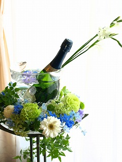 本日も花展練習作品のご紹介です♪これは1度、紹介した事のある作品なのですがぐんと完成度が増したのでふたたびのせてみました。 ワインクーラーのまわりをお花で飾り中にも コロビル をすっと挿しました。お水の部分には氷に見えるようにプラスチック製のガラスもどき。その上にはデルフィを浮かべてあります。(よく見えないけど・・・) 近寄ってみました。お花が浮かんでるのが見えたかな。グリーンとブルー、白の爽やかな海を感じさせる組み合わせ。なんたって海辺のカフェのイメージですから・・・・グリーンのお花は リシアンサス(トルコキキョウ)丈夫だし、豪華だし、今回の花展では大活躍してくれる花になりそうです。