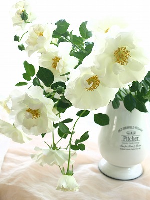 アジサイによく似た私の大好きなビバーナムが咲きました。去年越してきた我が家のテラスは風が強いので枝の長いビバーナムはビュンビュン振られて蕾がすれてダメになっちゃうんですよね。その過酷な条件を乗り越えて例年よりちょっと遅く数は少ないですがなんとか咲きました。そろそろ散り始めてきたのであわてて花あしらいしてみました。 新緑の5月なので爽やかに白とグリーンでまとめてみました♪ バラは オールドローズのスプレーウィット。(この前紹介したサーモンオレンジの色違い。)白いロベリアもちょっとだけ参加。黄緑のアルケミラロブスターは20日以上前に市場で仕入れた残りの子。 お花の形をした花びらなので散ったあともこんなにかわいい(*^o^*)写真撮影のあとはあわてて水に浮かべました。 ビバーナムを撮影しようと木から切っていたときのこと。フサフサのお花の中に茶色のもの発見!!よく見たら ヨトウムシ(たぶん)でした。昼間は花の中に潜んでいて夜になったら活動開始するつもりなのね。・・・・・ということでヨトウムシ撃退大作戦です!ブログのお仲間さんはハサミでチョッキンとするとのことでしたが私はシンプルに袋の中にいれて上から踏み潰します。どっちが残酷?と思うと、どっちもどっちですね(^^;残酷でもお花を守るためですから、やらなければね!