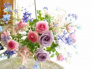 本日、花教室、花展の練習です。こちらは《花色ウェディング》のコーナーに飾られる卓上花。今回は卓上花は3卓置くのですが3卓とも違う花の色で作る予定です。 これは3つのうち1番きれいに写真が撮れたパープル~ピンクのグラデーションの卓上花。 パープルのバラ マダムビオレ とピンクのバラ シャンゼリゼ がゴージャスです♪ あとの2卓は イエロ~オレンジのグラデーションに水色で挿し色を入れる1卓と白とピンクでフワフワな卓上花の1卓です。テーブルクロスもお花の色に変えて飾る予定。今回は写真がきれいに撮れなかったので載せられませんでした。花展のときを楽しみに待っててくださいませ~