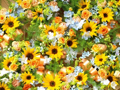 娘の中学校の30周年記念祝賀会に飾るテーブルのお花を頼まれました。実は私の卒業した中学校でもあるのです。なので、出来る限りのことはさせていただくわっと張り切ってテーブルの花、作りました。 ひとつ800円の依頼なので十分でしょう~?いつものことですが学校は予算がないので仕方ないですね。足りない人件費分はやはり同じ中学卒業の友達がボランティアで手伝ってくれました。中学校の祝賀会だから「ひまわり」が元気がよくて明るいイメージでいいかなと最初に選びました。それから爽やかにしたかったので水色のブルースターとパールブルー。そしてなんといってもポイントはリボンとオレンジのミニバラ(マリレーヌ)です!この中学校のテーマカラーがオレンジなんですよ。オレンジになった所以はオレンジ色のジャージを愛用しているから。制服があるのに、普段はオレンジ色のジャージで通学している生徒達。このオレンジジャージ、私が中1のときに決まったものなので長い歴史があります。(だから私も着てました!)最初の10年は嫌われていた(と校長先生が言ってました。)オレンジジャージがそれからは愛され続けているのだから不思議です。 ひとつだけ、校長室に違ったイメージでアレンジを作りました。ここだけオレンジはいれないで大人っぽく。ピンクのバラは ピンクブーケ。 初めて買いました。
