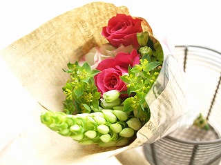 昨日、初めてブログを通じてお友達になった人とごはんを食べました♪メールのやりとりしかしていなかったので会うまではどきどき。でもメールは人柄がでますよねー会ってみたら想像通りのかわいい素敵な人でした。その人がこのブログを見ていて私がちょっと前にお誕生日だと知ってプレゼントを持って来てくれていました(感涙)ひとつは大好きな人が載ってる雑誌(日本じゃなかなか手に入らない貴重品!)もうひとつは この花束♪「お花の先生にお花もどうかと思ったんだけど・・・」といいながら渡してくれたのです。お花の仕事をしているとお花をすっかりもらえなくなってしまうのですがやっぱりお花をもらうのは嬉しい!!だってお花は大好きなんだもん^^帰りの電車でショルダーバッグから覗いてるお花を見てはニマニマしている私なのでした。 ラッピングされていたおしゃれな英字の包装紙を下に敷いて飾りました。 左側の長いのは オーニソガラム。グリーンは ブプレ。ミニバラ(なまえわからず・・・)トルコキキョウにSPカーネーション。蕾がいっぱいあるから長持ちしそうです。お花がある間中、幸せ気分が続きそう~~本当にありがとうございました♪