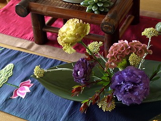 花展の練習作品、続きます♪今回はおととしまでベトナムに住んでいた生徒さんの作品。 私のお気に入り~~ベトナムの想い出~~ベトナムで集めた雑貨を使っての花あしらいです。下に敷いてある布にはきれいな蓮の花の刺繍がしてあって器に使っている陶器は ニューバッチャン焼(でしたか?)お花はアジアンな雰囲気に負けないようにいろいろな色をたくさん入れて。 ベトナムのアイアンで出来たかごにヘデラをあしらって。アジアンなベトナムの台にのせました。 この2つのほかに大きなピッチャーに絢爛豪華な花、ダリアやリシアンサスなどを活ける予定。 3つのお花とベトナム雑貨たちがどんな風にコラボするか・・・・お楽しみに!
