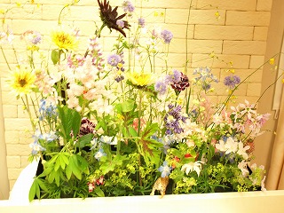 先月の花教室で紹介しなくっちゃ、と思っていた作品があったこと思い出しました! タイトル 花咲く楽園横に広い作品なので全体が写せなかった・・・これが左の部分。 これが右の部分。動物たちが隠れているのがわかりますぅ? じゃじゃーーーん。ワニもカバもいます。色がちょっと黄色がかっちゃったな~~ これ、花教室歴の長い上級者さんの作品です。前回の花展のときは大きなカゴに直径2メートルくらいありそうなお花を活けたのです。今回はこの動物をどうしても使いたい!とのことでいつもの作風とは全然違うイメージの作品にチャレンジ。普段見慣れない作品だから先生の私も他の生徒さんもしっかりと楽しませてもらいました。「ここにキリンがいるぅ~~」とか「本当に水の中にいるみたいになってきたーー」とか。ちなみに水はゼリーを使ってます。(生花用の)当日はもっと動物が増える予定だそう。もう~~とっても楽しみ♪♪♪
