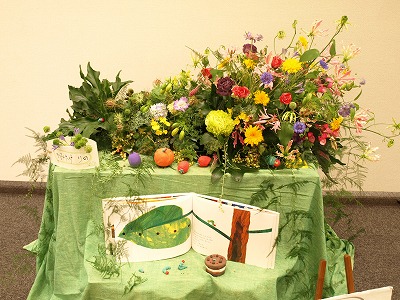 今日で 花展 第1部 終了です♪というのは今回の花展、パーテーションで3つに区切ってありましてそのうちの最初のブースが今まで紹介してきた「初夏の香り」~本日の「はらぺこあおむし」なのです。 はらぺこあおむし想い出と言われて 真っ先に心に浮かんだのが子供の頃毎日 本を読んだり 絵を描いたりはらぺこあおむしはその中でも一番のお気に入りでした実はその頃 仲の良かった男の子の家にもあったんです本を読むか その子に会いたかったのか分かりませんが・・・そんな想い出おもう一度味わいたくて絵本を買いに行きました鮮やかな色彩とあの頃の想い出が本の中からあふれ出しなぜか なつかしさを感じる一番想い出に残る絵本 はらぺこあおむし これを活けたのは私の生徒さんではありません。いつもお世話になっている「あ!お花屋さん」のスタッフでまだ20代の若いお嬢さんです。お花屋さんの仕事って規制が多くて自分の好きなように自由にお花を活けることってなかなかありません。なので、今回「花展にだしてみない?」と声をかけたのです。すると仕事が忙しいにもかかわらず「いいんですか?」と喜んで出品してくれることになりました。作品のタイトルも私が「花展のテーマが想い出なの」といったときからすぐに浮かんでいたそうです。 とっても個性的な作品。元気でエネルギーに溢れていてばりばり仕事してる彼女らしいなと思いました。あおむしなので、葉っぱがたくさん。ケールやアスパラ・・・・大きな葉っぱは何かなぁ。(すみません。葉っぱに詳しくなくて・・・・わからない~~)お花の色がカラフルなのは絵本の中にでてくるカラフルな食べ物をイメージして。手前に置いたいちごやプルーンは見覚えあるでしょ?左の葉っぱの上もよーく見てね♪ 葉っぱの上にのってるあおむし。絵本の前にも何匹もいました。果物もあおむしもぜーんぶ彼女の手作り♪紙粘土で出来ています~~ 個性的で楽しかった作品。ぜひ次の花展でも出品してくださいね~~♪♪よろしく♪♪