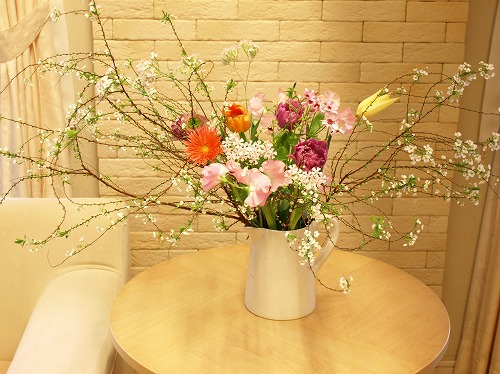 明日の花教室に向けて約1ヶ月ぶりに花市場に仕入れに行きました。一足早い春を感じる花たちをいろいろと買ってまいりました。“雪柳”1週間前に降った雪がまだ残ってるというのにもしかすると今晩からまた雪の予報(´・_・`)明日の朝雪が積もってたら生徒さんたち来られないな~と思いつつ積もった雪を背景に雪柳なんてどうよ、とメインは雪柳にしちゃいました。半分ヤケクソ。だって雪が積もったら仕入れしたお花が全部無駄になっちゃうんだもの。もー、雪は嫌だー。というわけで明日の生徒さんにご連絡♪「朝雪が積もっていたら無理して教室にこなくていいですよ~そのときはメールかお電話でご連絡くださいね。」“ラナンキュラス”少し大きめ。ソフトピンクと書かれていただけあってきれいなピンク(*^_^*)“サクラコマチ”今から桜が咲く頃まで気がつくと仕入れしてしまってる。淡いピンクも小さな花の集まりもすべてが好み。これが入った途端にアレンジが優しくほわっとなります。“ガーベラ”スパイダー咲き。蛍光オレンジが可愛くて衝動買いしました。あとはチューリップいろいろ。明日の花教室は雪柳と桜小町、スイトピーをセットしてその他の花は自由に選んでもらいます。雪柳の枝ぶりは投げ入れで生きるハズ。どうか明日の朝起きたとき雨でありますように。雪が積もって生徒さんが来られなくなったら雪の上に雪柳生けてこちらでご披露させていただきます・・・