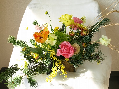 1月9日すっかりお正月気分も抜けきったころでしょうか。そんな気分ですが年末にお稽古した「お正月のアレンジ」を今更ながら紹介させてもらおうかな、と。ホントは松の内にアップするつもりだったんだけどねー年頭に誓った「マメにブログ更新」がいきなり守られていない・・・今年は黒い陶器にゴールドの模様の器。そのゴールドに合うようにゴールドにスプレーされた稲穂、黄色の花 オブリザタムがポイントです。メインの花は各自好きなものを選んでいるので個性が出てます。by chieby emiby mikiby miyukiby risaby sachiko