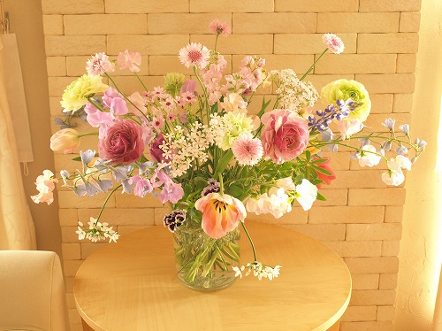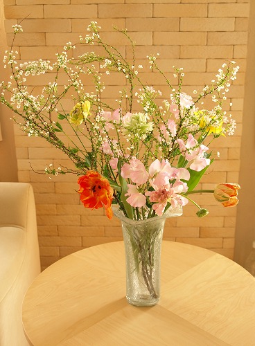 昨日の花あしらい教室、フリーコースいつもより少し多い6人の生徒さん。教室中が春の花で一杯。ベーシックコースより大きく生けるのでリビングが花展会場みたいでした。by toshiko柔らかい春の花たちを硝子の花瓶にたっぷりと。透明感があって春の匂い一杯の花あしらいです。by tomoピンクの琉球ガラスに春の花を可愛く。少しだけ黄色のレンギョウが入っています。黄色のレンギョウは「春が来た」を一番感じさせてくれる枝もの。by kao低いお皿のようなカゴに花あしらい。雪柳とレンギョウを生き生きと生けられました。オレンジのチューリップが効いてます。by non雪柳・レンギョウとチューリップ、ラナンキュラスを陶器に投げ入れ。ほんわか優しいトーンでまとめました。by uco自宅から恐竜の卵のような陶器の器を持参。雪柳・レンギョウが器の形状を生かして流れるように生けられました。by nachi雪柳に春の草花が調和して優しい花あしらいになりました。春の花は透明感があっていい匂いのものが多いです。生徒さんが一斉にたくさんの花を生けてくれると部屋中が幸せな景色と香りに包まれます。市場は朝早くて大変だけど行ってよかったな、としみじみ思えるひとときです。さ、明日も4時起きで市場だ。明日も天気悪くなりませんように。