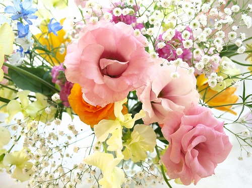我が家のリビングに飾ってある花たち。昨年末の仕入れだから10日以上経ちますがまだまだきれい(*´∀`*)“リシアンサス・桜ほのか”よく見えないけど花の中心部のぼかしの感じと名前が気に入って買いました。“桜ほのか”なんて綺麗な響きなんだろう。これ、違う名前だったら買わなかったかな、と思う。本来蕾が咲くと色が薄くなっていくものですがこれは蕾が1番花よりも濃いピンクになりました。ちょっと得した気分。珍しくかすみ草がたくさん。年末にお店に行ったら人気のないかすみ草が置き去りにされそうだったのでもらってきました。かすみ草って見た目が儚げだからかすかに香る匂いのイメージでしょ。違うんです。独特の匂いがかなり強く香ります。この匂いが苦手な人が多くてね・・・でも私は大丈夫。ぱっちり咲くかすみ草、結構可愛いですよ。