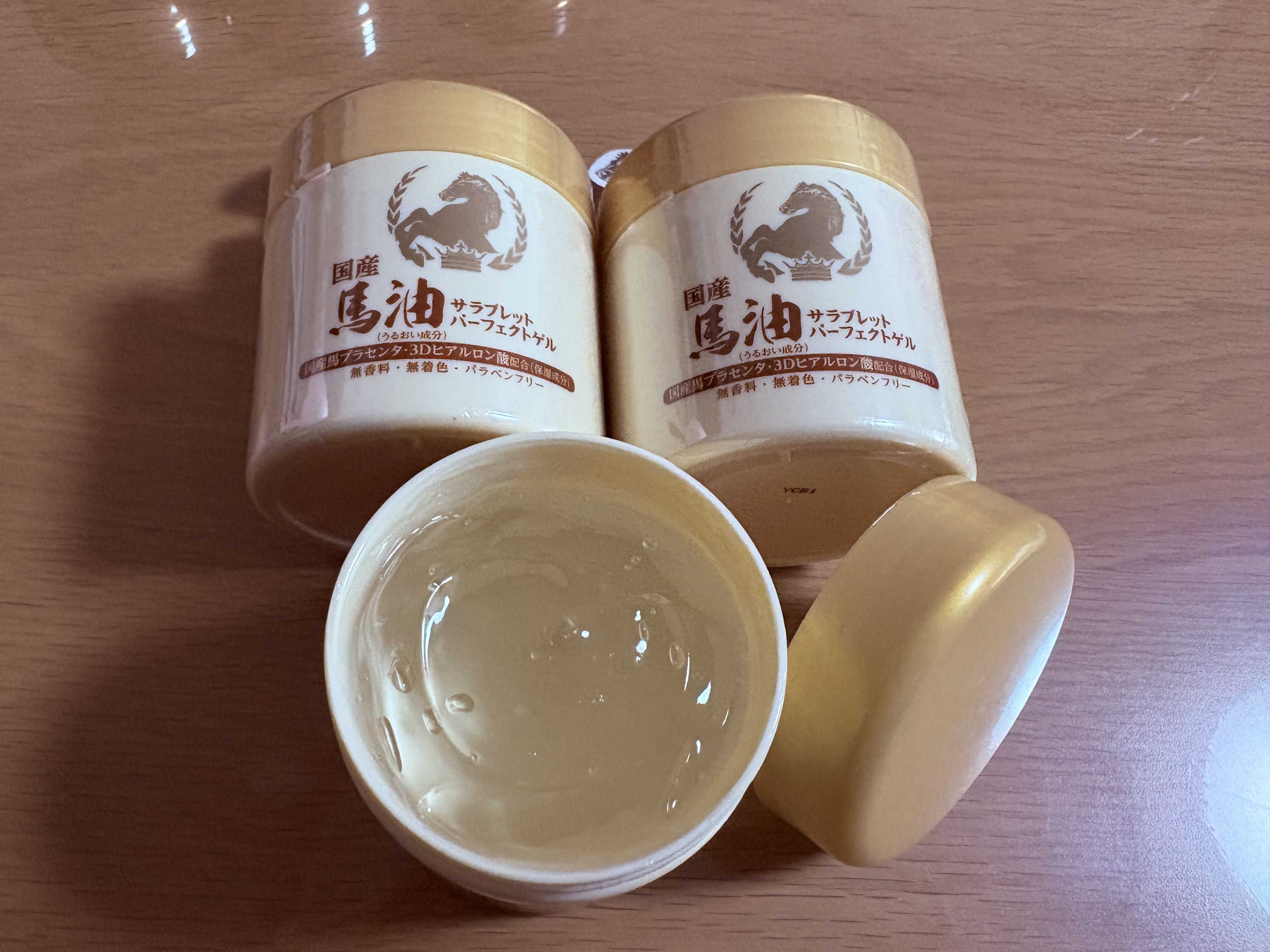 久々のモラタメです今回は【馬油サラブレットパーフェクトゲルX3個】です。参考価格3個で税抜き7500円を、税抜き2490円税込み2739円でこのゲル1つで化粧水、美容液、乳液、パック、クリームの5役おまけに国産馬油で北海道馬プラセンタと3Dヒアルロン酸配合だとか・・馬油未経験の私なのでこの際お試し~~ビックリするくらいプルプルで手に取れない~~(笑)取れたと思っても体温でどんどん液化していく~~(笑)すぐに顔につけて・・・水ぽいと思ったけど、時間が経つとともにお肌がしっとりしてくるんです。不思議~~翌朝はプリプリお肌です。凄いミッフィーも一緒に使ってます~~