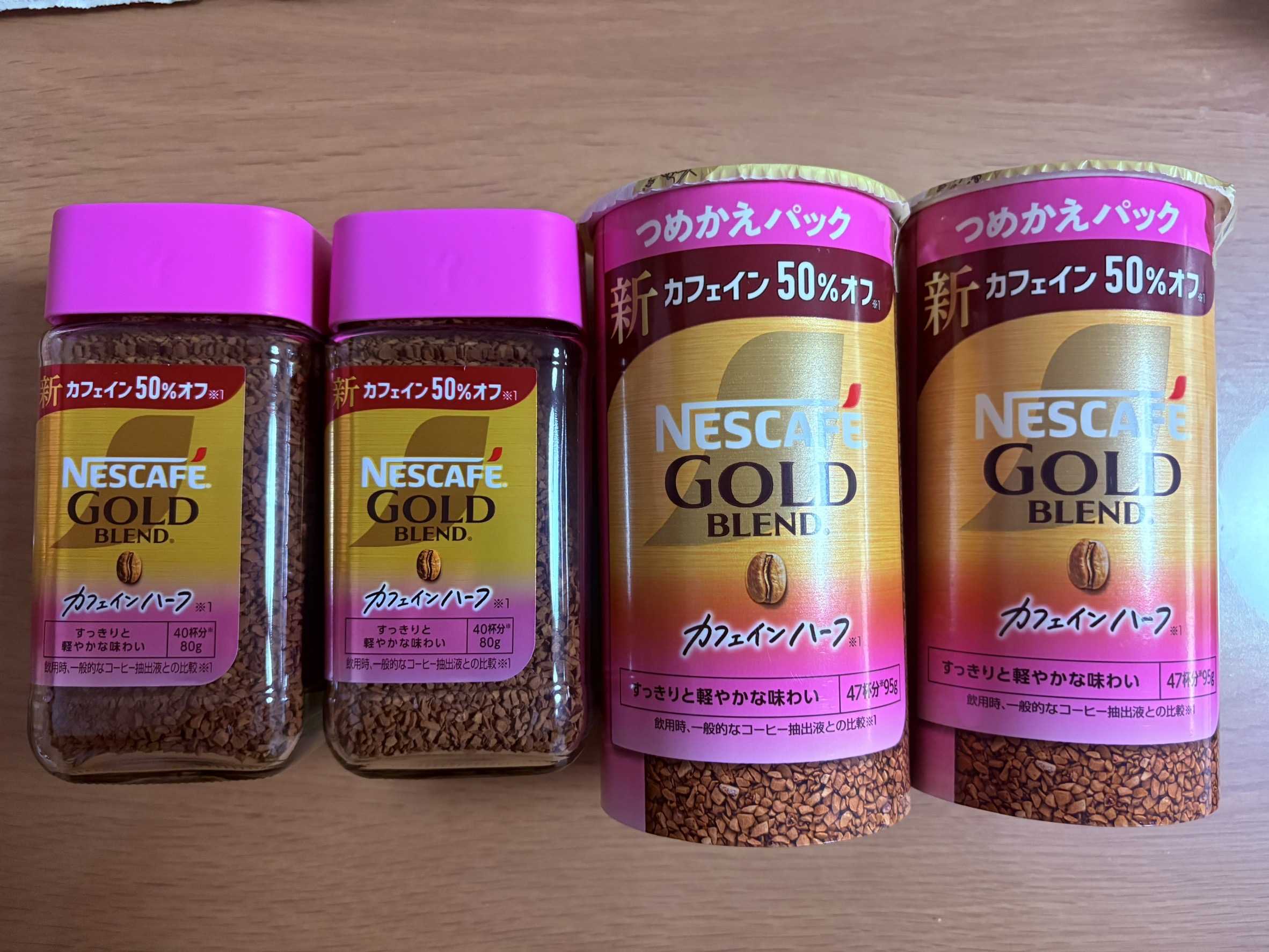 続けてモラタメはこちら【モラタメ【ネスカフェゴールドブレンドカフェインハーフ+詰め替え 4点セット】参考価格4点セット、税抜き価格5122円を税抜き1600円税込み1760円でピンクのパッケージに蓋が可愛くておまけにカフェインハーフということもあり、お試し~~このパッケージ初めて見ました。味が落ちるのかなと思いましたが全くそういうことはなくむしろこっちの方が好きかも年とってきたせいか、すっきりした味のこちらが飲みやすいです。これまで豆を挽いてお茶代わりに飲んでた私はもうそこまで飲んでないし・・・時々豆・・・時々インスタント・・・健康を考えながらコーヒーを楽しみたいです