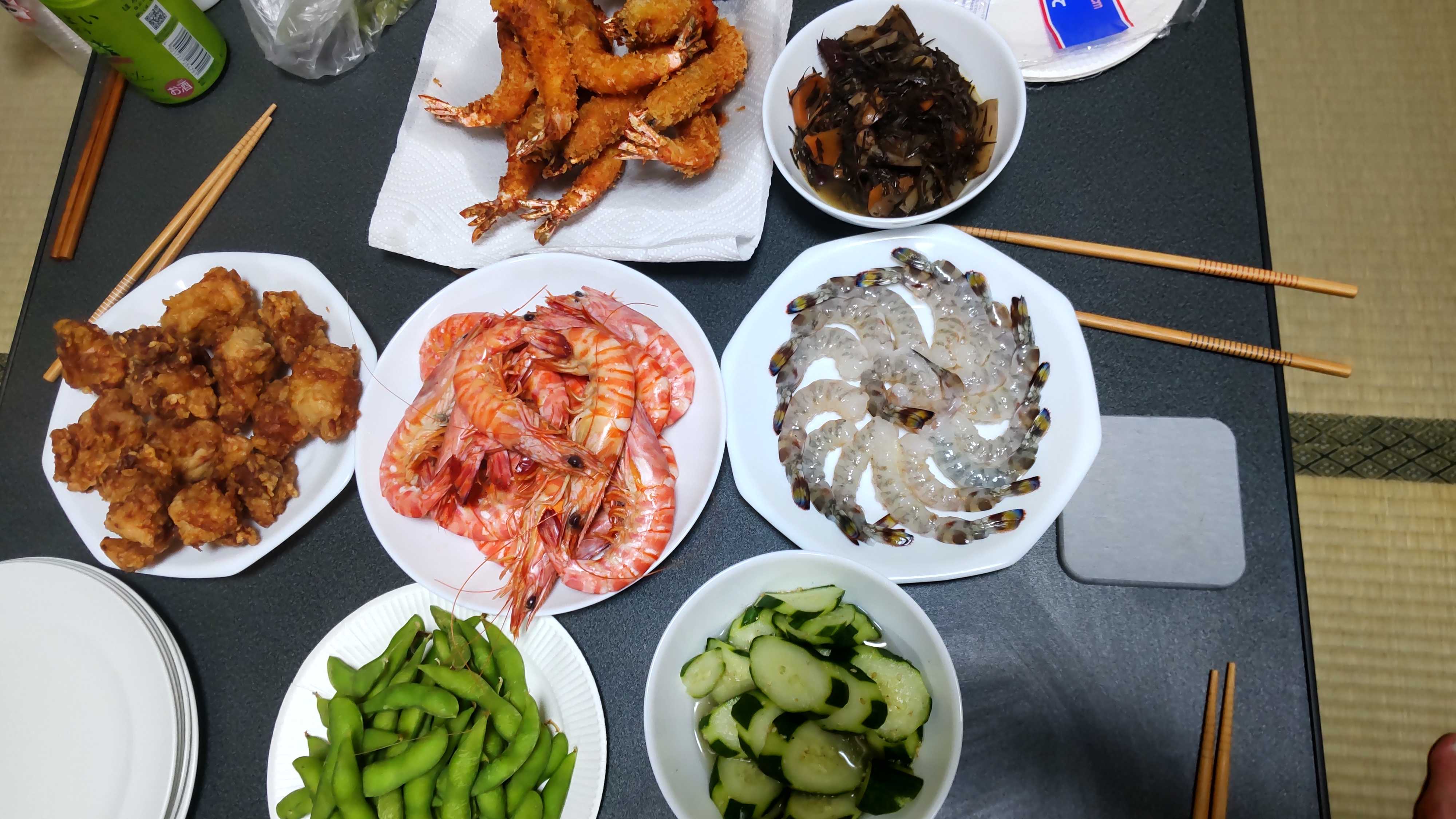 車海老のお刺身、エビフライ、ボイルした車海老、買ってきた唐揚げ。枝豆、