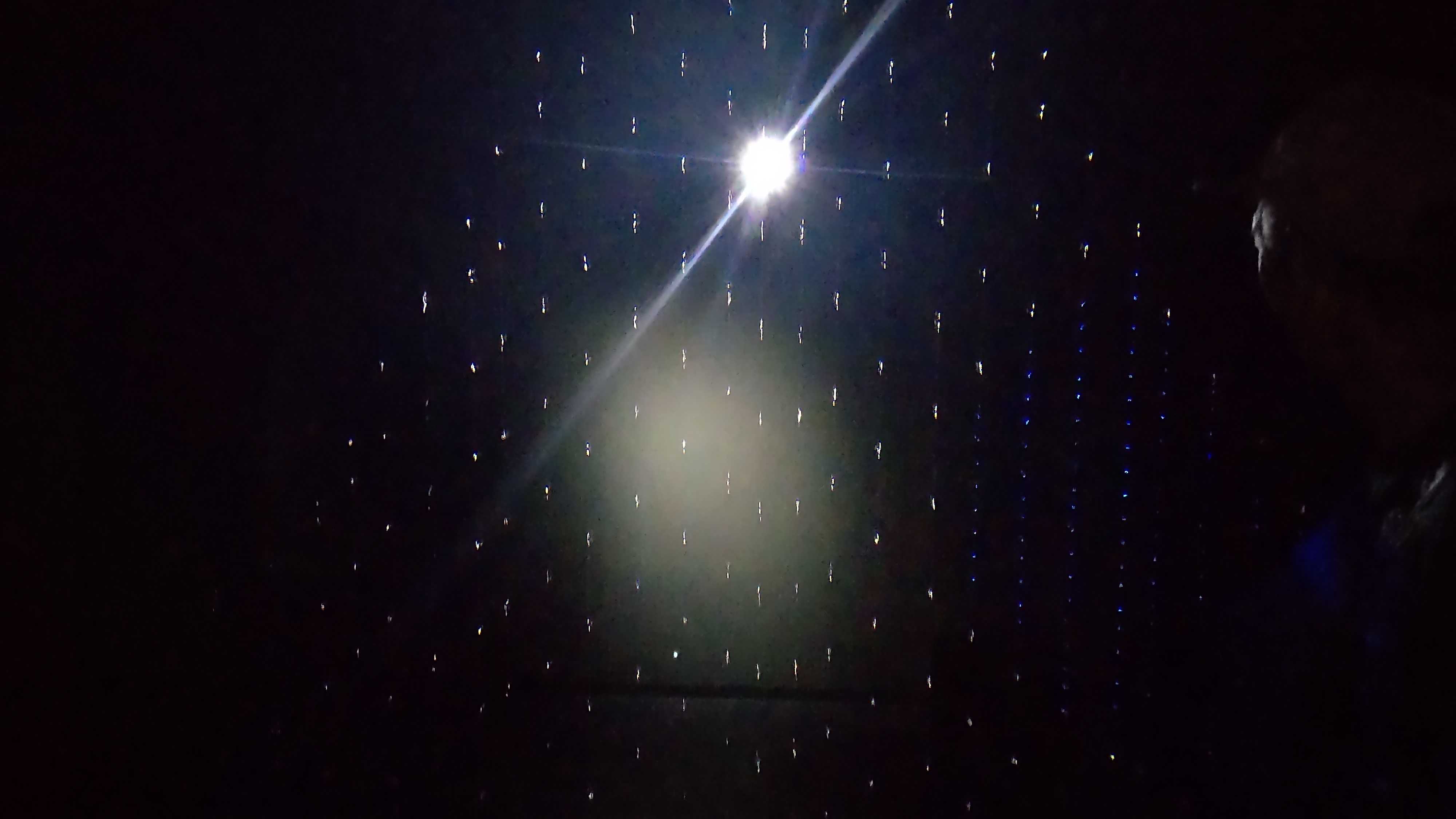 落ちてくる水に光をあてて 幻想的な世界 水に触れてみることもできます。