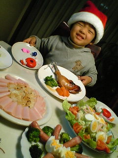 今日は一日早くクリスマスメニューでした!!母が鶏もも肉を一人づつ焼いてくれました。それと、信州に行ったときに買ってきたトウモロコシをミキサーにかけたコーンスープとサラダと・・・鶏もも肉は家族の大好物で オーブンで焼きたてのジューシーな鶏をかぶるのが恒例です!3歳の甥っ子は自分の顔くらいあるのに1枚をペロリと食べます!(怖いでしょ!)みんなが一生懸命料理をしていると甥っ子もお皿にいろんなおもちゃをのせてこれはママの。これはパパの。。。ってみんなの分を作っていた~(^_^;)↑写真に写ってるヤツです~コーンスープはとっても甘くて美味しいんですよ~今日は裏ごししたので、さらになめらかでした!胃腸が弱っている私には鶏ももはちょっとだけ食べたんですが柔らかくて美味しかった!それと、スープが身体に優しくてよかったです!それからケーキを食べました~~ 甥っ子からのリクエストのケーキ!サンタさん乗せてね~って!朝からずっと楽しみにしていました。3段に苺とクリームをふんだんに使ったのでデコに使うクリームが無くなってしまい。。。とっても汚いケーキになってしまったのです(^^;)でも、家族みんな喜んで食べてくれました~私もちっさくカットして味見!!ジェノワーズはフワフワで大成功でした~そして今日は高かった苺!すっぱいだろうな~って思ってたら甘くて美味しかった!!!!見た目が悪いけどお味は成功でした!