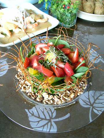 今日は親友との座談会でした!今回は妹と甥っ子2人も一緒に親友宅へお邪魔しました~座談会っていってもランチ会のような贅沢なお昼でした☆親友が用意してくれたお料理の品々・・・! 苺のサラダこのカゴ素敵でしょ。。。パスタを編んで作ってたのですって!それに、苺と伊予柑とサラダほうれん草苺をピューレ状にして作ったドレッシング!!クルミも一緒に頂きました~見た目も味も最高です! 大根のマリネ海苔を下敷きにしたのがオシャレですよね~とってもあっさりしていて美味しかったです~☆ 生ハムとトマトのカッペリーニ と 野菜のポタージュ親友がお得意の野菜のポタージュ・・・有機野菜をたっぷり煮込んだ素材が生きていると~っても美味しいスープです!これは子供から大人まで本当に美味しい~☆そして贅沢に生ハムが入ったカッペリーニ!とっても美味しいです!! 奥が親友作の 五目いなり手前は私が先日瀬田料理教室で習った青ネギと海老と数の子のサラダ五目いなり・・・揚げが薄くてやわらかくとっても味も上品!そして、五目ごはんが入っていて味も食感も楽しめる 贅沢で美味しいお稲荷さんでした☆私が作ったものは先日瀬田料理教室でとっても美味しかったので是非親友と妹に食べて欲しいな~って思ったので作ってみました~瀬田シェフのソースはさすがに親友と妹にも人気で喜んでもらえて良かったです~☆☆☆デザートはモチロン私が担当~ 食後のデザートに??ちょっと変な感じだけどゆきいちごを~~!この季節になったらコンビニでもお見かけするヤ○ザキの「雪苺娘」を真似て作りました~この間、ローソンで買って食べたのですがやっぱり生クリームが・・・これなら作ってやろう~って思って作りました~ 断面はこんな感じです~ジェノワーズは前日に焼いておいて苺はあまおう求肥は冷凍求肥クレープを使いました・・・・これは便利☆初めて作った割には合格かしら???親友の用意してくれたお料理は前日から準備が大変だっただろうな・・・って本当に申し訳なく思ってしまうくらい手が掛かっててとっても美味しい品々でした!なんて贅沢なんでしょうね・・・いろいろ話をしながらこうやって一緒に過ごせる時間が本当に贅沢だと思います。子供達もけんかもしながら?楽しそうに遊んでいました!そんなこんなで本当に時間はあっという間・・・あ、それでもまた3時のお茶もしたのですよ~(*^_^*)親友が入れてくれる紅茶は本当に美味しいんです~今日はムレスナティーの「ストロベリー」そして、作ったものは・・・ 小山シェフのレシピでNEW YORK チーズケーキ成功してるかカットするまで心配でしたがまあまあの出来でした!濃厚なチーズケーキでクセになる感じでした~小山シェフといえば先日「きょうの料理」に出演されていました~!シェフは「去年、あまり喋らなかったのでもう呼んでもらえないかと思ったんですが・・・」とおっしゃってました~確かに去年のは 結構シ~ん・・・としてました!よく喋るし面白い方なのに。。。本当に今日も幸せな一日でした~食って本当に素晴らしいですね~美味しいものを頂いて楽しいおしゃべり・・・いつも思いますがこれ以上に幸せなことって・・・ありませんね!!