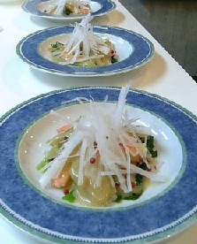 今年から大好きな瀬田亭(フォレドリキウ)お料理教室に入れて頂くことになりました~~♪今日は第1回目☆☆☆瀬田シェフはフランスで修業され、マドリードの日本大使館公邸料理人ブリュッセルEC大使館公邸料理人・・・等勤められたスゴイ方でラ・キュイジンヌ<フランコ=ジャポネーズ>日仏融合料理を標榜されています教室では 瀬田シェフが考案された7つの魔法のソースを学びます今日のソースは2種類教えて頂きました~ 青ネギ・数の子・海老のサラダこれはマスタードをベースにしたソースです!お店と同じ!!って感じで本当に感激でした!!このソースはおひたしや豚しゃぶ等にも合うそう~!素晴らしく美味しい☆☆☆ 鶏もも肉のローストメインは鶏ももをオーブンでローストした柔らかいフワフワのお肉~それに 味噌とクリームチーズを使ったソースです!!!味噌を使ったソース・・・まさに日仏融合料理ですね!鶏肉の他に豚にも合いそうな日本人の口にぴったりなソースでした! デザートはクレープと紅茶を入れて頂きました~オレンジのソースと冬みかんがさっぱりしたデザートでした!!とっても勉強になりました~本当に美味しいですし家庭で気軽に作れる内容でした!すごく楽しかったです☆2月も楽しみ☆☆☆