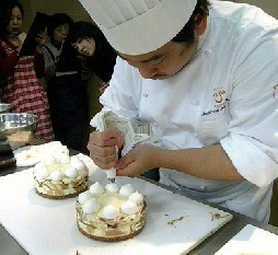 あの有名な御影高杉 の 高杉シェフ の ケーキセミナーに行って来ました!とっても優雅で贅沢な夢のような時間でした~ケーキセミナーと言ってもお菓子を習うセミナーではなく本店の2階「カサブランカ」で高杉シェフの作られたケーキを頂きながらシェフのお話をお聞きする贅沢なセミナー☆素晴らしいお菓子を頂きました~ オレンジのセミコンフィとの相性がとてもおいしいクレープシュゼット濃厚なフランスの味本当に美味しかった・・・思い出しただけでも もう一度食べたい!ここでしか頂けない苺のミルフィーユ そして シブースト アイスクリーム くるみボール・・・私は高杉シェフのパイが一番すき~(よく高杉の「りんごのパイ」を日記で紹介していますよね・・・(^人^))本当にこのミルフィーユは最高です~シブーストは 贅沢に渋皮栗が入ったチョコレートのケーキ甘さはしっかりしています高杉のケーキはちょっと甘いな。。。って思ってましたがシェフはフランスの味を伝えたいとのことで苺ショート等はフランスにはないケーキだけどジェノワーズを強力粉で作って雰囲気を出しているそうです。フランスには薄力粉がありませんものね!ジェノワーズもシロップでアンビベされてしっかりとした味ですそして、そこに苺の酸味がとってもさやわかで口の中のキレが良くなるというか・・・ショートケーキの苺はサンド用とトップに飾るものと種類を替えておられます~食べた時のことを計算されているのですよね!高杉シェフは苺を触っただけで「どれくらいの酸味と甘みと水分かが分かる」っとおっしゃられてまいした。すごいですね・・・フランス料理のシェフもされてたので左手で持っただけでお肉の量も何グラムか分かると・・・さすが、経験もおありですが「毎日が進化」とおっしゃられてた所が尊敬でした・・・毎日お菓子を作るのが楽しくてしょうがない!毎日発見があって毎日進化していると。だから今のお菓子が完成型ではありませんと。日々学んでいるとおっしゃられるのです。本当に素晴らしいですよね。それに、「僕はウソ偽りや隠したりするのは嫌いです」と笑っておっしゃられクレープシュゼットのルセットも口頭で教えてくださいました!え?教えて頂けるのですか?ってこちらがビックリしてしまったくらいです。すばらしいお菓子やお料理を作られる方は本当に気さくで人柄がよくてまた、こだわりといい意味での頑固さも持っていて素敵な方ばかりだな・・・って思います。本当に優雅で素敵な時間・・・感激の一日でした!(実はセミナーが終わって・・・ 私はあつかましくも、大好きなパイのルセットをお聞きしてしまったのです☆)すっかり私は高杉シェフの大ファンになりました~(^人^)