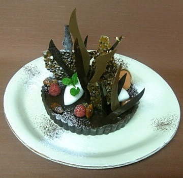 エスコヤマお菓子教室2月はタルトショコラでした~☆かなり手が込んでいるのでレッスン始めからシェフが「今日はどんどん進みますから~」っと遅かった人は終わるのに5時間半もかかったそう・・・「ひえ~!」って感じで始まりました~☆・ショコラのパートシュクレ・ガナッシュが2種類(ホワイトとノワール)・チュイール・プレートチョコ・アーモンドプラリネ・・・と工程がたくさんありました・・・やっぱりチョコレートのテンパリングやガナッシュの仕込みが難しく全員がシェフに確認してもらいながらの作業・・・! シェフ作のタルトショコラです~☆さすが小山シェフの芸術ですよね・・・ 試食用はこんな感じです~カットしてからデコするとこういう風になるのですね~す~~っごく濃厚でリッチな味。。。ホワイトのガナッシュにアーモンドプラリネがすっごく香りが良くって。。。そしてフランボワーズにペパンジャムを入れているのですがこれがガナッシュと合うんですよね!こんなに手が込んだお菓子は家で作るのは至難の業・・・材料をそろえるのも大変なのでアレンジが必要です! これが完成作です~実は。。。ガナッシュの乳化が成功したのですがタルトに流す時の温度がちょっと低くなってたみたいで・・・平らに流れてくれなかったのです(^_^;)シェフに相談してみると「常に31°Cをキープせなあかん。。。」と。。。温度計で測ってないのに31°Cをキープするのは難しいですね。そして、「これはこれで楽しみかたがあるよ」とのことで、ぐるぐる~~って渦巻き状にデザインしてもらいました!「失敗は成功のもと~」とかって自分たちが勝手にいいながら!なので、シェフのはぴか~って光っているのです~デコもシェフはダイナミックですね~私のはこぢんまりしている・・・人間性が出ているのでしょう~(゜o゜)チョコプレートとチュイールをシェフのようになが~く割ることが出来ず・・・チュイールも分厚いのでやぼったくなりがち!でもお味はとっても美味しくって家族は皆よろこんでいました!!大変だったぶん本当に勉強になりました~(*^_^*)