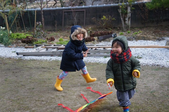 凧遊びがしたくてたまらないのですが無風だし庭だし・・・でも持って走りたいんだよね。毎日どんどん大きくなっていく怪獣娘たち。上のもうすぐ4歳になる姉は靴のサイズ18センチに近づく勢い