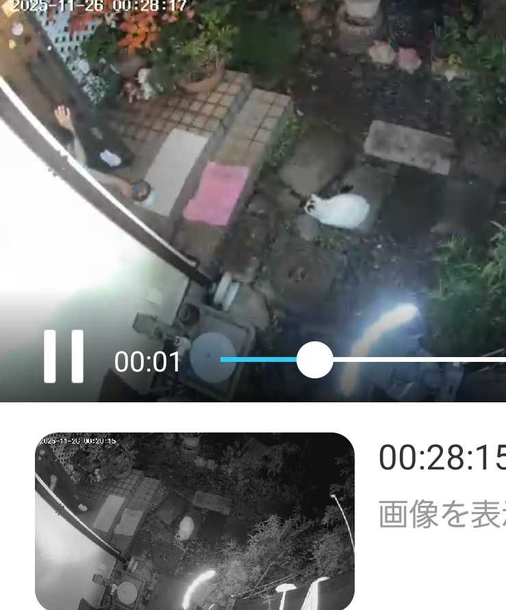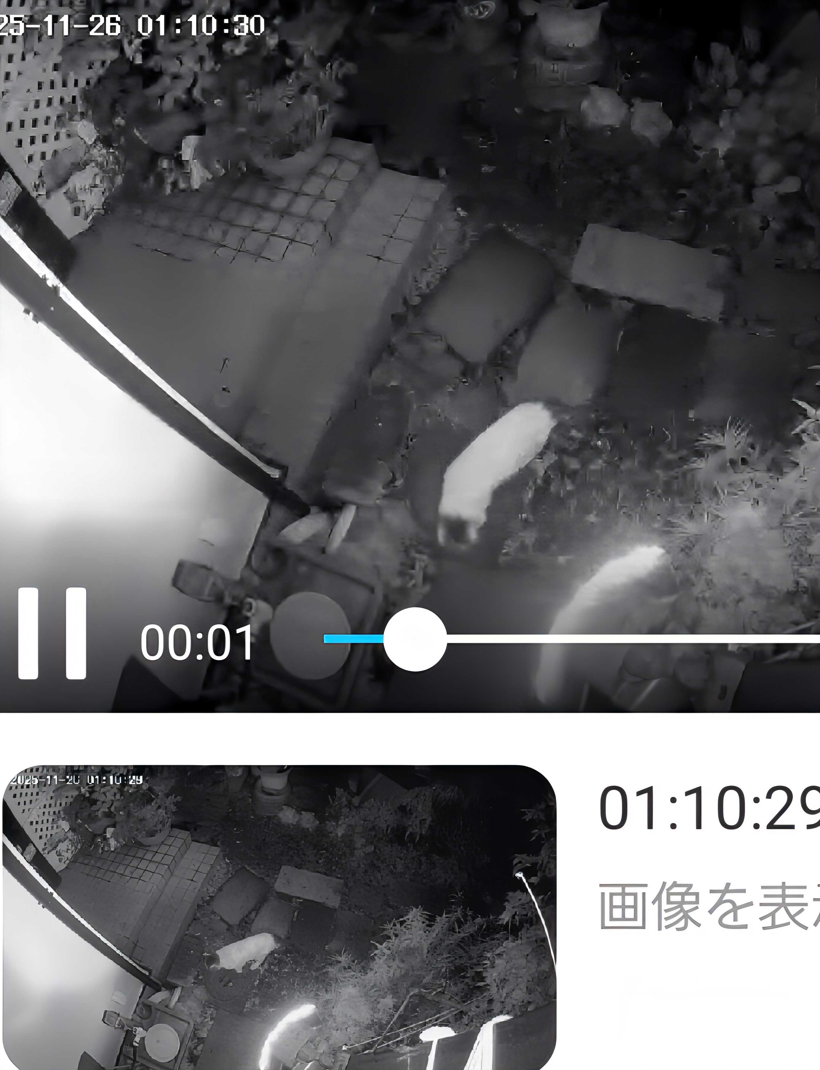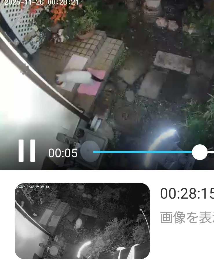 夜になって雨が止んだので、玄関前に足拭きタオルを敷いて山盛りのカリカリを置いといたのが既に空っぽ。玄関前を少しウロウロしてから畑の方へ歩いて行く姿だけ写っていましたよ。