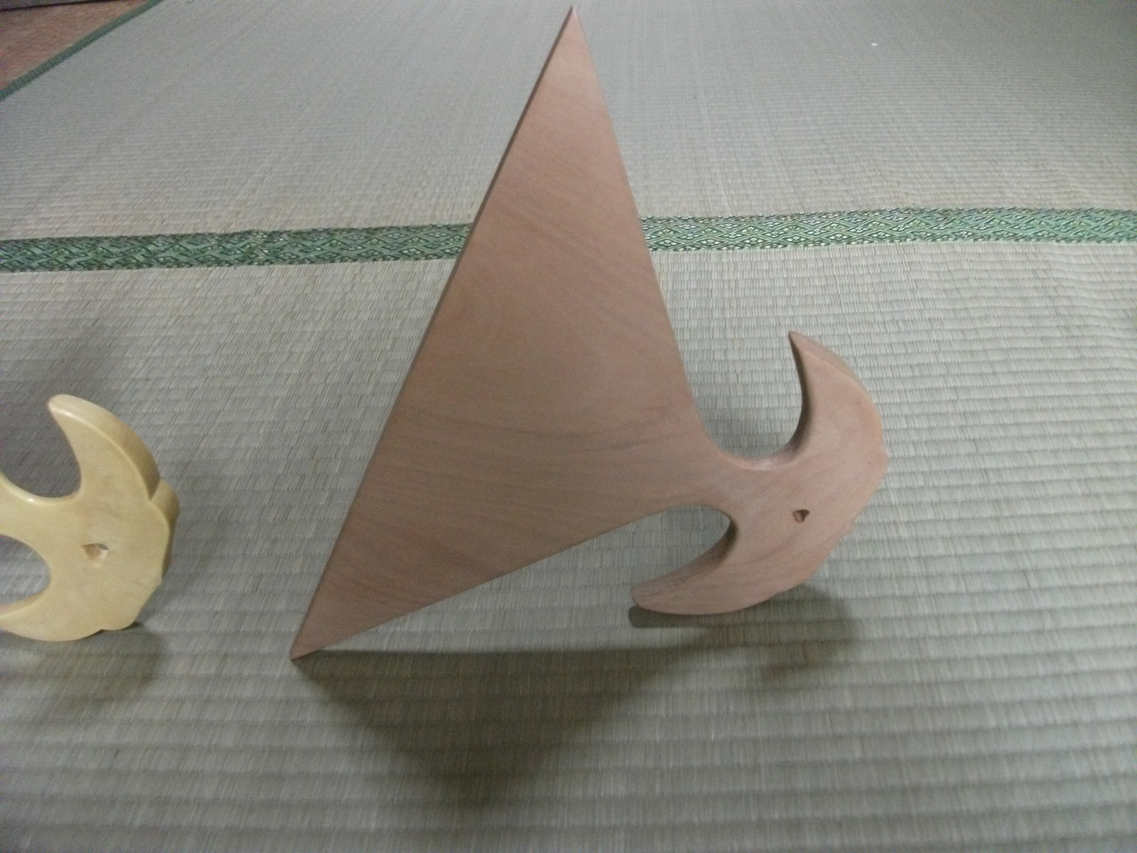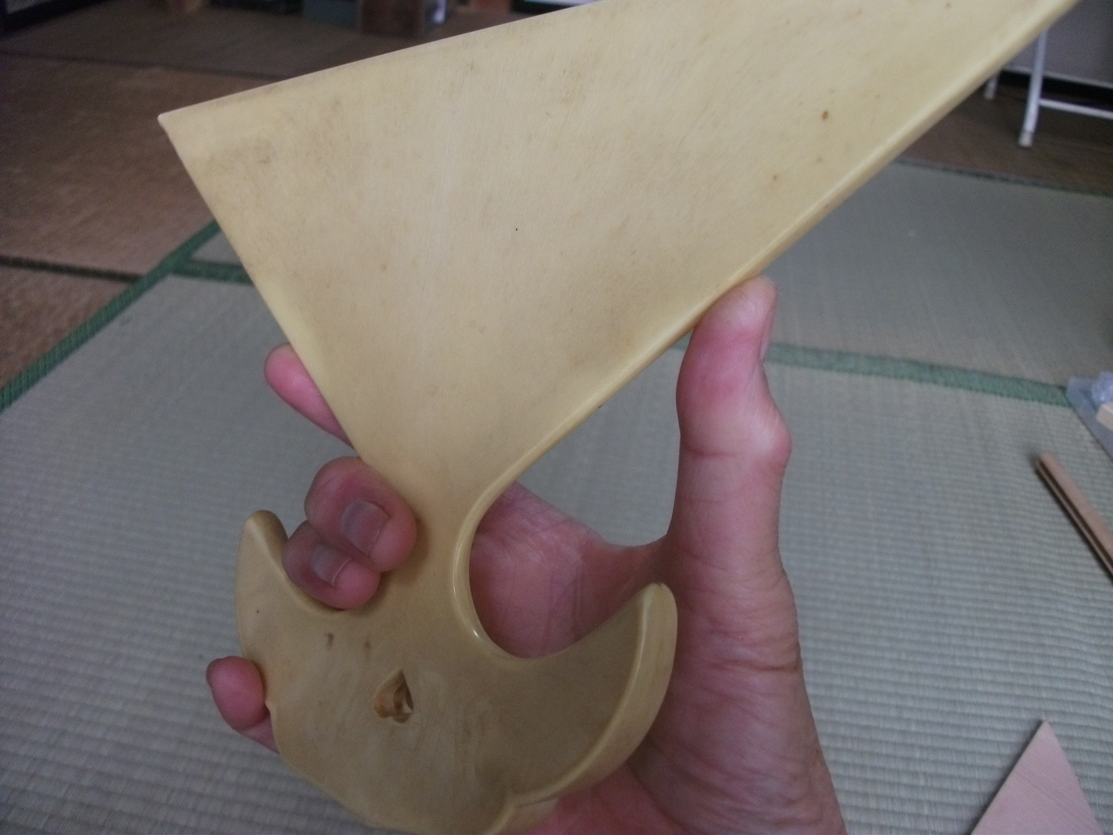 薩摩琵琶の撥の「大きな三角形」と「撥握る部分の月型の部分」この2つのバランスが取れてると「支えがなくても‥撥は一人で立ちます」で、月型の部分のポチんと空いてる孔は「その調節?」らしい・・と、今は亡き琵琶の大先輩が、「良い撥の証拠♪」と教えてくださいました。もちろん「新品」の状態で、です。だから「椿材のこの撥は、薩摩琵琶の心得のおありの方が作られたのでしょう」撥そのものは「御立派♪お見事♪」・・・でも「鞘」が気に入りませんので‥今、自分で作り中(苦笑)・・琵琶と撥をどう「包み」「運んで」「演奏家」は動くか・・考えておられないようです・・「厚すぎる!」・・きゃはは薩摩琵琶の撥の一番良いのは「柘植」・・でも高価で入手が年々難しいらしいです・・・2番目(?)が椿❓…確か、あの有名な鶴田先生が、最初に使われた・・そういう噂聞いたことあります。これだって「?万円」するでしょうから‥上手くならないと「撥さばき、撥の材質による違い」これは、まるで(苦笑)わからない「みたい」なので、無理しないで「安いもので、良いと思います」・・・プラスチック製(色付き)‥もしかしたら、武蔵野楽器さんの職人さんの初期のころのものかもしれません。ちゃんと「薩摩琵琶の撥」をおわかりで彫られておられますもの♪1枚板から「彫る」のだそうですが‥撥を握る部分の曲面に彫跡らしい凹凸が見えました・・・数年前注文したのですが、職人さんが怪我をなされたそうで・・・未だ品物は届きません・・どうぞお大事に・・残念ですが・連休中は、一人で介護頑張り、来週は胃ろうの交換手術で、病院の往復、その後の病人の安静・・琵琶弾く時間は取れませんが‥弾いてみま~~~す