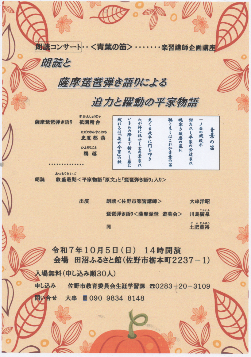 形をご提案する「段階」の朗読と琵琶・・私あんまり「本気じゃ≂ありません‥スケッチ、試し❓の段階なもんで・・」(苦笑)佐野市で、2025.10,5日朗読とお弟子さんが共演♪地元で活動される朗読のO氏がお招きくださいました。前半は、薩摩琵琶の独奏「祇園精舎、忠度、鵯越」、後半に平家物語の「敦盛最期」の原文部分で「朗読(原文と創作文)と琵琶」で1曲を作り上げます。 薩摩琵琶の一般の方々にわかりやすい特徴は「戦いの描写=崩れ」ご提案しましたら、御受け頂きました・・この話は途中からでてきました・・とてもアイデア豊富な方で、100パーセント希望取り入れられず残念。本来は合同練習3回くらいするべきですが。働くお弟子さんには無理、で、こういう「間にパーツとして組み込む」形とさせていただきました。 お互い「録音を聞いて頂き」「つなぎめ」を「当日リハーサルする」・・もちろん一般の方に「さわり音付きの複雑な琵琶の音」を聞き分けるのは、絶対音感ある方なら簡単ですが・・無理なので「ひたすら(苦笑)」琵琶の側が「相手に引き渡す時は、単純なアシライ 1~3ケの単純な弾き方にする」という、「相手に合わす」という、薩摩琵琶の古典曲形式の「あくまでも・・おのれのリズム」を少し弱める(?)配慮がいります・・・これが多分、お弟子さんには「始めて」 でもこの呼吸がつかめれば‥お弟子さん達、なんとでも「共演」可能になると‥思いま~~~~す