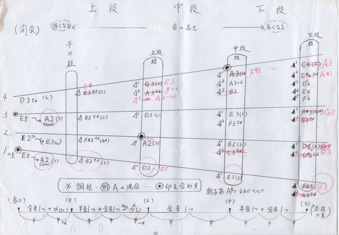 数年前、琵琶の修理頼まれた時の記録動画ご覧になり、古い薩摩琵琶4絃4柱を多分オークションで購入され、電動のこぎり に サンだー まで購入され、欠損した柱作られたそう・・で、柱の位置、関係は琵琶屋さんに聞いたのだそうです。‥このケースだと、多分、琵琶を習う弾くというより、「琵琶という楽器に完成させたい?」方なんでしょう・・・琵琶のためだけに「電気のこぎり、サンダー」はすごいですから・・どうぞ琵琶らしく完成したら「ぜひ習って、本物の琵琶の音色・音を覚え」「サワリ」とりもできるよう・・伝統芸能の継承者になってくださいませ♪で、本当に薩摩琵琶は不思議な楽器です・・このブログ始めたころ、2番目の師匠にお別れしたころで、琵琶&食べ歩きの友がいまして、琵琶の研究も2名で一生懸命、国会図書館やら神田の古書店やら、インターネットの検索もして、情報交換=豪華お食事会してました~(食べる方が中心のような・・苦笑)それぞれ先生は違いますが、「琵琶が好き」は共通・・ずいぶん「わかりました~~~下の表は「2番目の師匠は、調弦は、4の絃は中段!譜面表記も、3種類の▲使う」・・これを伝統的な調弦の友に説明するのに作りました・・・安いチューナーなので、音の高さは、多分「間違い多し??」琵琶の各柱の関係・・は一番下に書き込みました・・・此の時は「私と友」がわかれば「満足♪お祝いに豪華 ランチ♪」なので・・・お互い「何の資料から・・わかったか!」はぜんぜ~~ん気にせず・・・すみません・・まさか「あれから15年!‥琵琶奏者になっちゃいました~♪先生になりまして~~~お弟子さんに教えてま~~~す♪」なんてなるとは‥露しらず・・・どうぞ、皆様の方で根拠御調頂ければ幸いです」(陳謝)・・これがそれほど「嘘」ではない・??のはその後 何面か琵琶修理して「あれま~~~演奏できますよ???」でわかりました・・・下のものは、今回「大干の柱が、糸と5ミリ離れてて、ぎっしり押さえないと弾けません‥柱の高さは?」とご質問でしたので・・・琵琶の世界は、「音」の世界・・流派、会派により異なる「音」なので。。錦心流なら「有名人の鈴木流泉先生」のメモが故師匠の教えなので・・・とご説明した「原本」です・・・ただ、このメモでは「下段の柱はちゃんとしている」という大前提で書かれているようで、・・古い琵琶を「鳴るようにする=弾ける・・ではありませんで・・」・・明治大正昭和の始め頃の古い琵琶だと・・・あの当時たくさん琵琶屋さんがおられ・・❓???の琵琶がほとんどで・・・「まず4の絃の柱の位置、高さ」が本当に「正しいのか?」から始まるケースがほとんど・・・そうすると「琵琶の本当の音色」が解らないと????形だけは「薩摩琵琶」だが音色は???の琵琶ちゃんになりそうですね・・・