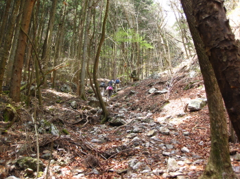 急に暖かくなってきました。この週末はあちこちのサクラの名所はお花見客でにぎやかだったことでしょうね。毎日のように地元の山・古賀志に登っている夫に誘われて、今日は私も古賀志へ行ってきました。 いつも歩く北登山道ではなくて、夫についてあっちこっち回ってみたので意外な発見があってとっても楽しかったです。(最近の古賀志は登山道が余りきれいでないので、何となく敬遠していたのです。だって、せっかく咲き始めたイチゲやカタクリの上に伐採した杉や檜の枝が覆ってしまっているのですから)古賀志もさすがにいい季節、結構混んでいました。 それに城山西小の「孝子の桜」を見に行く車で手前の道路も渋滞気味でした。北登山道の途中から登山道をそれて中尾根に向かって登りました。ちょっと急ですが、思ったよりも登りやすく、途中岩登りの場所もあって結構面白かったですよ。中尾根の鎖場の下からさらに北への道を取って、「559」と呼ばれるピークに登りました。ここは中尾根を歩く時に横目で見ていただけで、登ったのは初めて、見晴らしの良い一休みにいい場所でした。残念ながらうす雲が出ていたので四方の山がぼんやりとしか見えませんでした。でも、この辺にはアカヤシオが結構たくさんあって、もう開花を始めていたのはうれしかったです。帰りは富士見峠の下からカタクリの咲く斜面を回ってきました。カタクリはちょうど満開で、今の時期はここを目当てに登ってくる人もいるようでした。さらに東稜見晴台の直下から続く道へ登ってみたらなんと、実にすっきりした印象のきれいな道で、こんないいところをどうして正規の登山道にしないのかと思いました。(東稜見晴台の直登が危険だからかな?)この道沿いにトウゴクミツバが咲いていました。一本だけだけれど、花つきは良かったですよ。この山で見たのはたぶん初めて、いつもと違うコースを歩いてみて得をしました。今日もまたテンガロンハットをかぶったこの山の主のN沢さんに会いました。確かもう80歳は過ぎているはずなのですが、実にお元気で、今日もどこかのグループを案内して「559」に向かって登っていました。毎日、駐車場に車を止めて、余り山に慣れていないような人を見つけると、それとなくいい場所へ案内してくれる、古賀志を隅々まで知り尽くした人です。彼ほどにはなれないにしても、できるだけ長く二人で元気に山登りを楽しんでいたいものです。