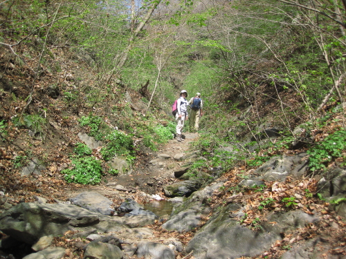 今年も足利市最高峰の山「仙人が岳」に行ってきました。今年一番の暖かい、というのを通り越して暑いくらいの日でした。宇都宮から足利までのドライブの間、どっちを見ても満開の桜、桜で歓声が上がりっぱなし。今年の桜は、突然にどこもかしこも満開になってしまって、何をそんなに急いでいるでしょうか?「岩切登山口」から「熊の分岐」経由で山頂まで登り約2時間、下りは「犬返し」の鎖場経由で「猪子峠」に抜けるコースをとり、約3時間かかりました。この山は登山道に可愛い花がたくさん咲くのでなかなか足が進みません。「ヒトリシズカ」「エイザンスミレ」「トウゴクサバノオ」「ネコノメソウ」等等・・・。そして、登山道の左右はずっとニリンソウに覆われていて、女性好みの道といえるかもしれません。 なかには間違って「サンリンソウ」になっているのもありました。 そして今年もありました「落ち葉のプール」 そうそう、今年は「マムシグサ」ももう鎌首を持ち上げていましたよ。 「熊の分岐」を過ぎると、あのやさしいピンクが目に飛び込んできます。そう「アカヤシオ」です。 今年も花の季節がやってきたなあとしみじみ感じさせる可愛い花です。アカヤシオを楽しみながら663mの山頂にたどり着き、桐生の町が見えるところでお弁当にしました。ちょうどお昼時だというのに山頂は先着の3人のグループがいたのみ、平日に登れるありがたさをしみじみ感ずるほどの静かさでした。この日は比較的健脚の5人だったので、復路は猪子トンネルの上を通るロングコース。 岩切からの花いっぱいの沢コースと趣が違って、見晴らしの良い尾根歩きを堪能しました。数年前に山火事で焼けた場所はまだそのまま残っていて、一度焼いてしまうとなかなか回復するのには時間がかかるもののようです。焼け払われてさらに見通しの良くなった場所からは「松田ダム」が見下ろせて、歩くにしたがってダム湖が近づいてくるのが歩く張り合いにもなりました。 ここで出会った女性から、この先にはアカヤシオは咲いていないと聞いて、気落ちした気分で先へ行ったのですが、大丈夫!去年ほどの花付きではないにしても、ちゃんと咲いてくれましたよ。 この週末あたりがちょうど見頃になりそうですが、混むでしょうね、さぞかし・・・。それにしても毎年思うのですが、「熊の分岐」の標識「山頂まで20分」「猪子峠?まで90分」というのはどんな人が歩く時間なのでしょう? 単独行の男性が休まずに歩く時間なのかなあ? 私たちはいつもその倍もかかっていますよ。「犬返し(犬返り)」と呼ばれる7~8mの鎖場を5人全員が無事に降りるだけでもかなりの時間がかかりましたから。スルスルと猿なみのスピードで降りるのは夫のみ、私とNちゃんなどは年に一度だけだからと必死で頑張っても短い足が予定の岩場になかなか届かず、必死にしがみつくので、翌日には腕が筋肉痛になるほどなのですから・・・。きれいな花大好きな「花旅」仲間も連れてきたいのですが、そのときは往復同じ道が安心かなあ・・・などと考えながら帰路につきました。