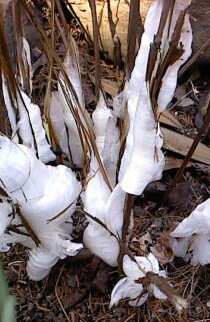 今朝はこの冬一番の冷え込み、宇都宮は氷点下5℃だったとか・・・。この寒さのおかげで、中央公園を散歩中に「シモバシラ」があることに気づきました。「霜柱」ではなくて、シソ科の植物の「シモバシラ」です。 図鑑で見たことはあるのですが、こんなに近い所で実際に見ることができるなんて・・・!嬉しくなったので、友人の理科の先生にケータイで撮ったこの写真を送ったら大感激・・・明日、もう一度二人で見にくることになりました。地中から吸い上げた水が導管から漏れて凍るのですが、導管が破裂してしまったら、もう見られないのでしょうからこんなにきれいな状態のシモバシラを見れらた私は幸運なのですね。それにしてもいつも手入れが行き届いていて、枯れ葉さえ落ちていない公園なのに、ちゃんと枯れた株を残しておいてくれるなんて、気のきいた職人さんたちだなあ、と感激です。そうそう、元日から始めたウォーキング、ちゃんと続けていますよ。初日は 8,000歩台、それが次第に増えて、今日は15,000歩以上・・・。万歩計を買ってきて、「健康ウォーキン」のサイトにも会員登録しました。インターネット上で仮想の旅を楽しんでいます。