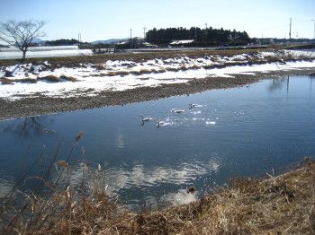 Aちゃんさんおすすめの真岡市の穴場へハクチョウを見に行ってきました。場所の説明が適切だったので、まったく迷わず五行川までたどり着き、車の中から川面を探す間もなくハクチョウがいるのが見えました。ただ車を停める適当な場所を探すのに少々苦労しましたが、ともかくもカメラ片手に川岸へ。 時間が悪かったのか(ちょうどお昼頃)この日は5羽しか見られませんでした。でも、水の中に顔を突っ込んで餌を探したり、時々岸に上がったりしながらゆったりと上流に向かって移動していく姿はとても美しくやはり鳥の女王様と呼ぶのががふさわしいです。 下流から一羽の白鳥が飛んできましたが群れの仲間に入ることもなく北へ向かって飛び去って行きました。 少し離れた場所に一羽だけでいたのは「シラサギ」。ハクチョウとはお互い干渉することもなく、そっと見送っているかのようです。 南の空はよく晴れて筑波山が青空に映えてきれいでした。真岡近くまで行くと筑波山がとっても近いですね。 でも、北の空は灰色の雲に覆われ私たちにおなじみの男体山や高原山は全く見えませんでした。日光や那須の山々にはこの日も雪が降り続いていたようです。