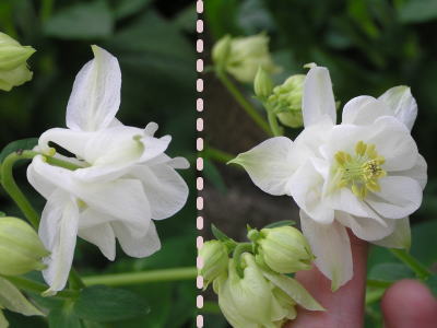 3枚目、オダマキ。多分教材からのもの。他の2株はローズだったのに、これはつぼみが薄いグリーンで何色が咲くのかと思ったら、白いオダマキでした。下を向いて咲くので、指で持ち上げた写真も。白いオダマキの清楚な感じでいいです。気に入りました。