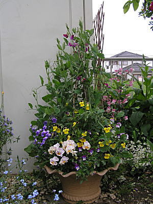 1枚目はパンジービオラとスイートピーのコンテナです。今はスイートピーが満開なんですが、この写真は咲き始めたところですね。実は下のパンジービオラがヨレヨレで、今撮影してもダメダメなんです。